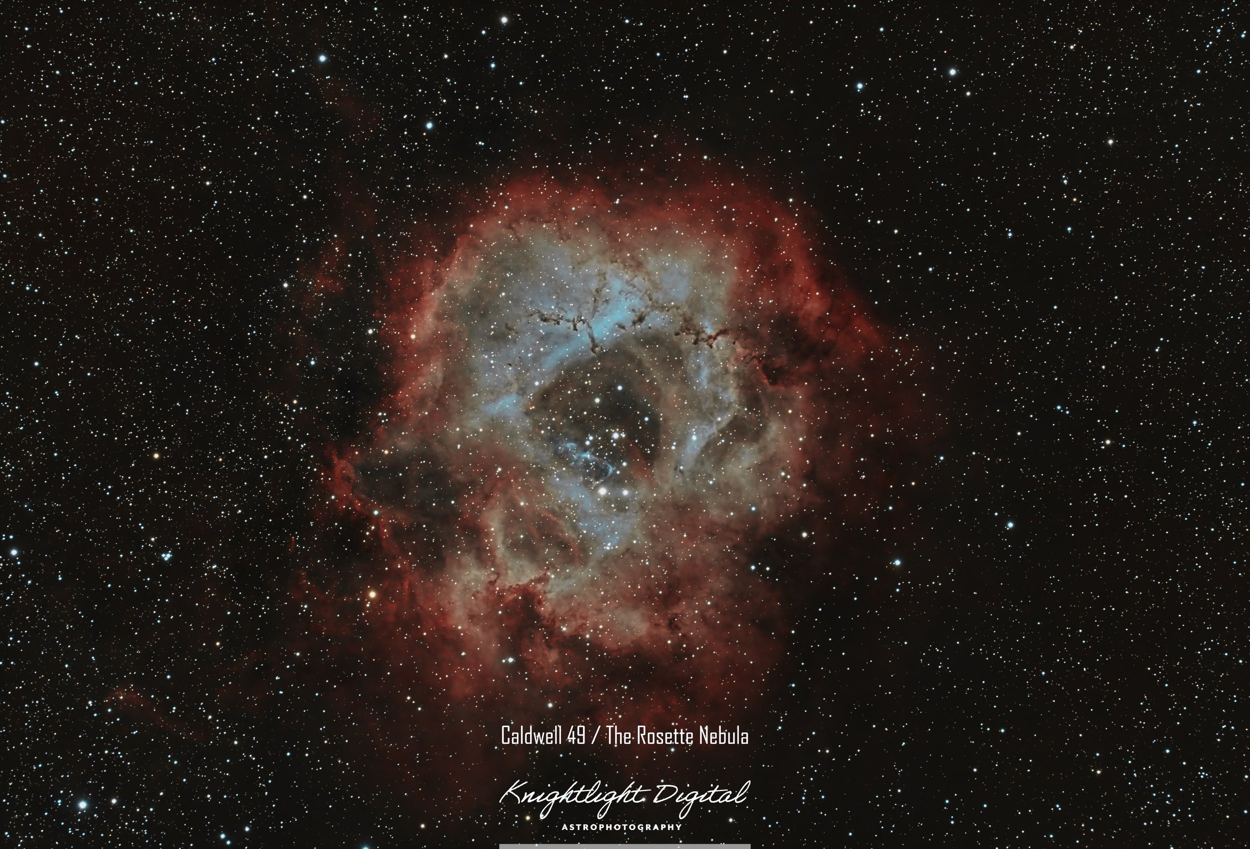 Imaged on November 12, 2024. This image is composed of 3 hours of data: half in Ha/OIII and half in SII/OIII (The Askar C1 and C2 filters, respectively). The weather had not been very cooperative and it was only by pure luck that I pointed the telescope at the Rosette at all. The seeing ended up being pretty good so I let the scope run all night. With some help from a fellow astrophotographer on TikTok, I worked my way through splitting and recombining the data to get the result you see. An AI-generated description of the nebula is posted below.